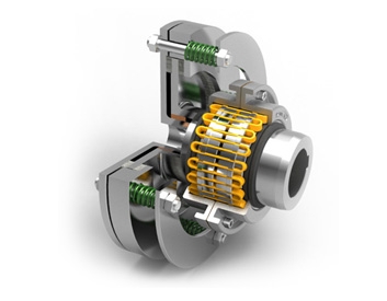 Acoplamento com limitador de torque. Possibilita através de simples regulagem mecânica, determinar o torque máximo transmitido, prevenindo o sistema contra quebras de eixos ou outros danos decorrentes de sobrecargas ou travamento do equipamento movido.