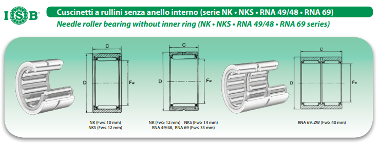 Eles apresentam uma alta capacidade de carga e um volume mínimo. Rolamento de Agulha ISB sem anel interno são montados diretamente no eixo, usando-o como uma pista;