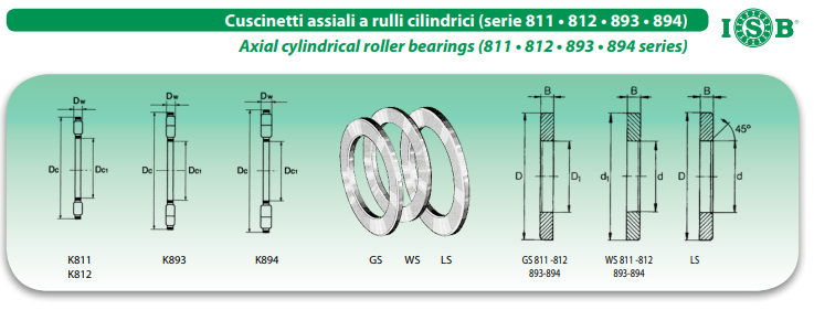 Os Rolamentos axiais de rolos cilíndricos, são compostos de uma gaiola de rolos cilíndricos axiais, com uma arruela pilotada tipo caixa do tipo GS, e uma arruela pilotada por eixo do tipo WS;