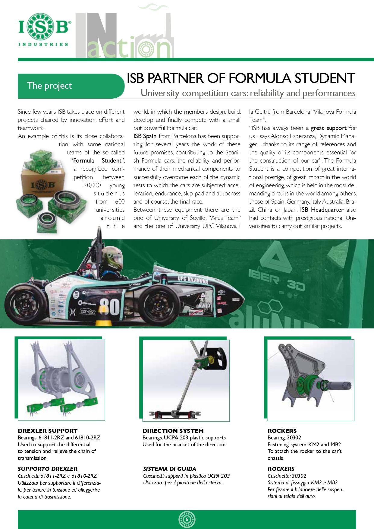 Os rolamentos radiais de esferas de uma carreira da ISB são utilizados em várias aplicações, por exemplo: * maquinaria agrícola; máquinas de movimentação de terra; * bombas; * maquinaria industrial para limpeza e engarrafamento; * motores elétricos; * máquinas de fitness; * equipamentos de usinagem (aço, vidro, mármore, madeira); * sistemas de abertura automática; * etc.