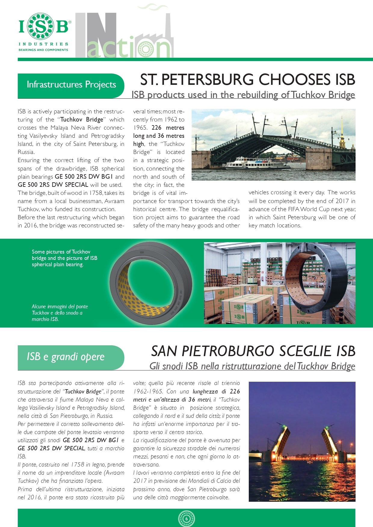 “Per permettere il corretto sollevamento delle due campate del ponte levatoio, verranno utilizzati gli snodi GE 500 2RS DW BG1 e GE 500 2RS DW SPECIAL, tutti a marchio ISB.”